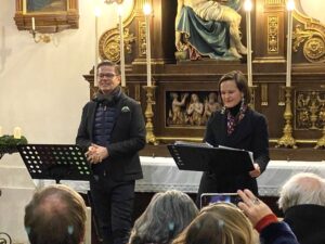 Zwischen den einzelnen Melodien führten uns die beiden Sänger mit kleinen Geschichten und Gedichten in die stillste Zeit im Jahr. Sehr berührend war die Erinnerung an die, in diesem Jahr leider viel zu früh verstorbene Sopranistin, Beate Ritter. Ihr zu Ehren sang Claudia Goebl „L’heure exquise“ von Reynaldo Hahn.